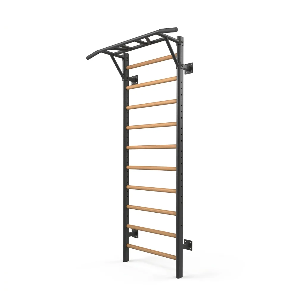 Sustav uključuje 10 drvenih prečki s ovalnim presjekom (40 x 32 mm), ravnomjerno raspoređenih s razmakom od 220 mm, te gornji truss s 6 protukliznih ručki idealan za zgibove, gimnastičke i funkcionalne vježbe. Ljestve su dodatno ojačane 4 čvrstim zidnim nosačima širine 108 mm, koji osiguravaju savršenu stabilnost tijekom intenzivnog treninga. 🔩