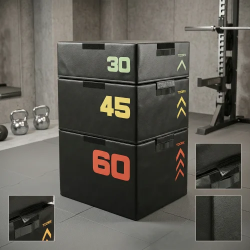 - Modularni “Stackable” sustav: Tri kutije različitih visina (30, 45 i 60 cm) možete koristiti pojedinačno ili ih slagati jednu na drugu (sve do 135 cm), što omogućuje progresivan trening za sve razine spremnosti.
